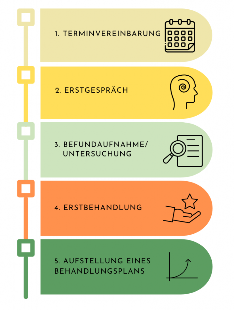 • Nach der Vereinbarung eines Termins erfolgt ein Erstgespräch/Aufnahmegespräch. Hierfür nehme ich mir ausreichend Zeit. Je mehr Informationen ich über Ihre Beschwerden und therapeutischen Ziele habe, desto effizienter können wir die Therapie beginnen.